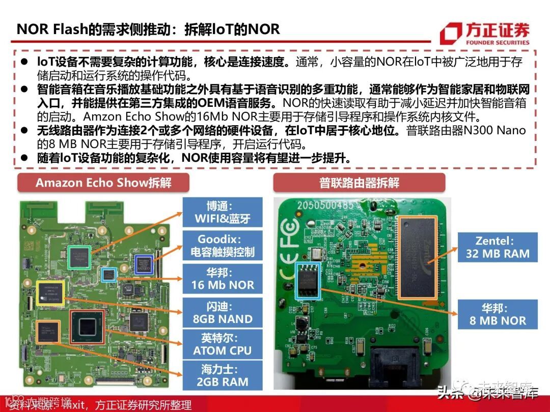 。NOR的快速读取有助于减小延迟并加快智能音箱 的启动。Amzon Echo Show的16Mb NOR主要用于存储引导程序和操作系统内核文件。无线路由器作为连接2个或多个网络的硬件设备,在loT中居于核心地位。普联路由器N300 Nano 的8 MB NOR主要用于存储引导程序,开启运行代码。