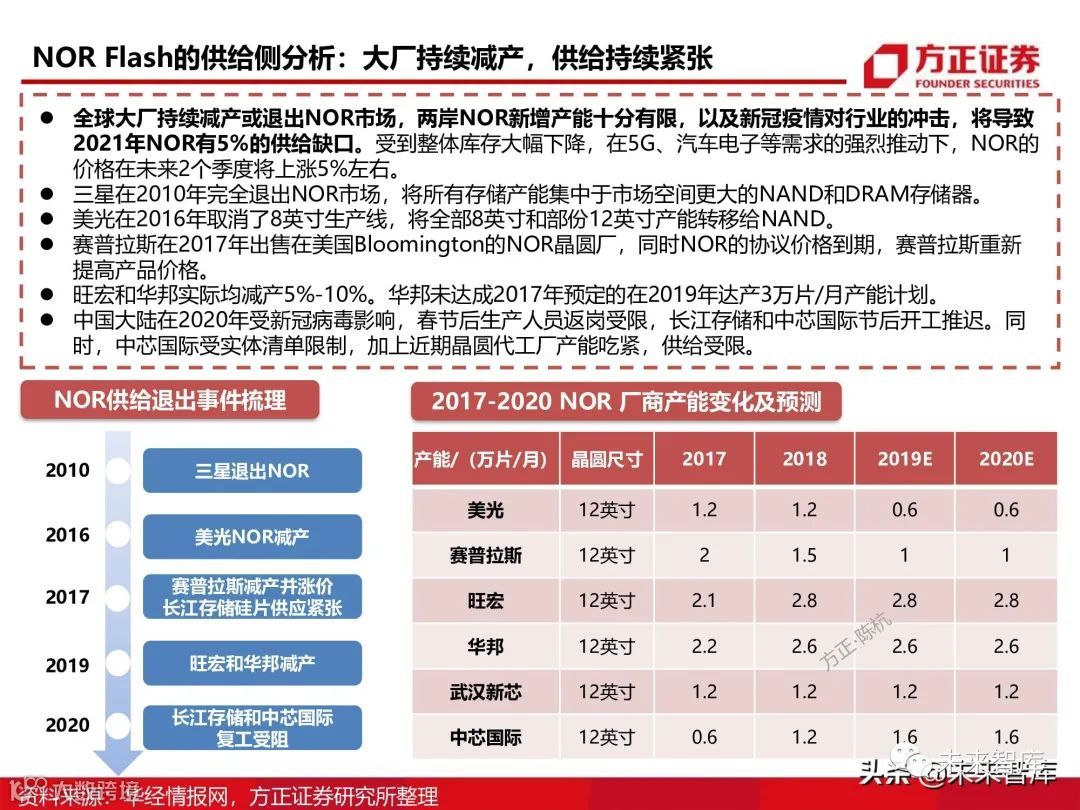 全球大厂持续减产或退出NOR市场,两岸NOR新增产能十分有限,以及新冠疫情对行业的冲击,将导致 2021年NOR有5%的供给缺口。