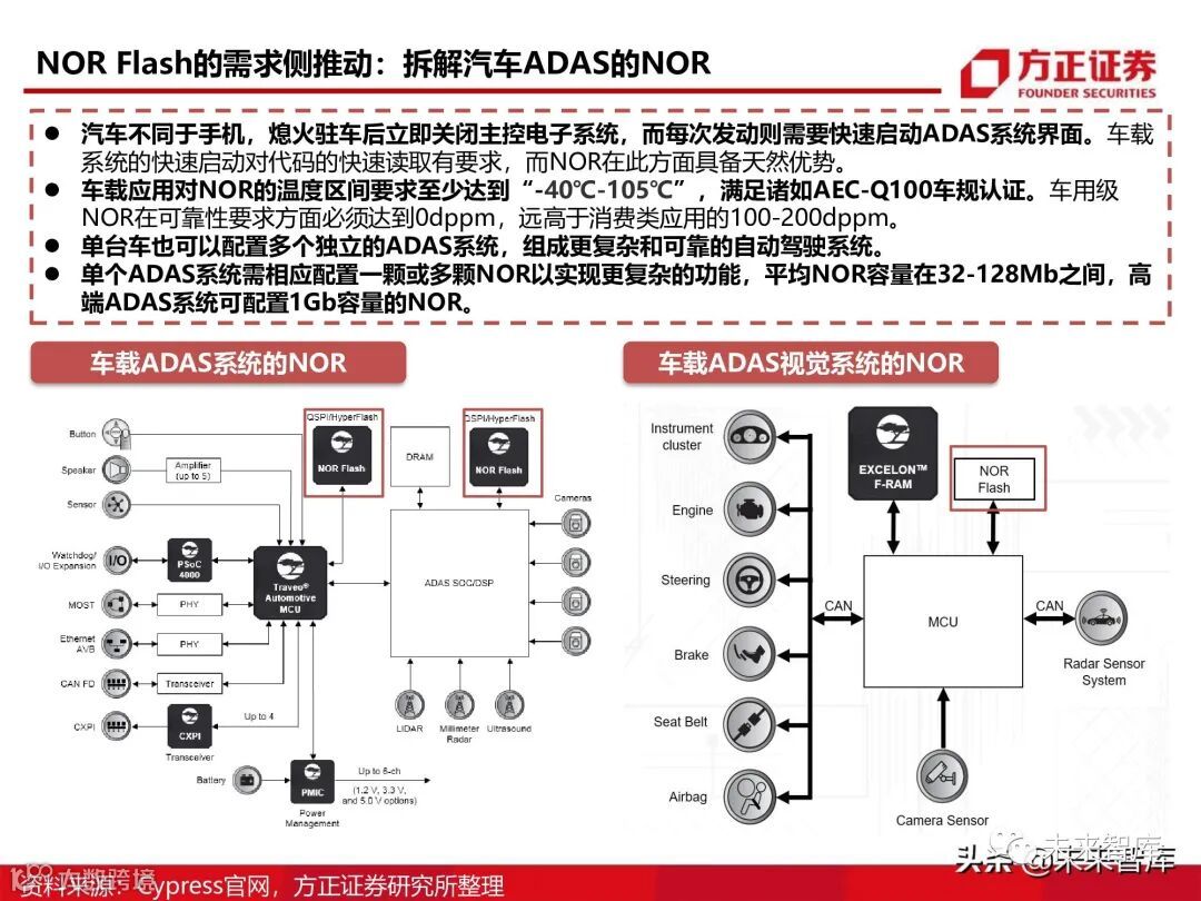 区间要求至少达到“-40℃-105℃”,满足诸如AEC-Q100车规认证。车用级 NOR在可靠性要求方面必须达到0dppm,远高于消费类应用的100-200dppm。单台车也可以配置多个独立的ADAS系统,组成更复杂和可靠的自动驾驶系统。单个ADAS系统需相应配置一颗或多颗NOR以实现更复杂的功能,平均NOR容量在32-128Mb之间,高 端ADAS系统可配置1Gb容量的NOR。