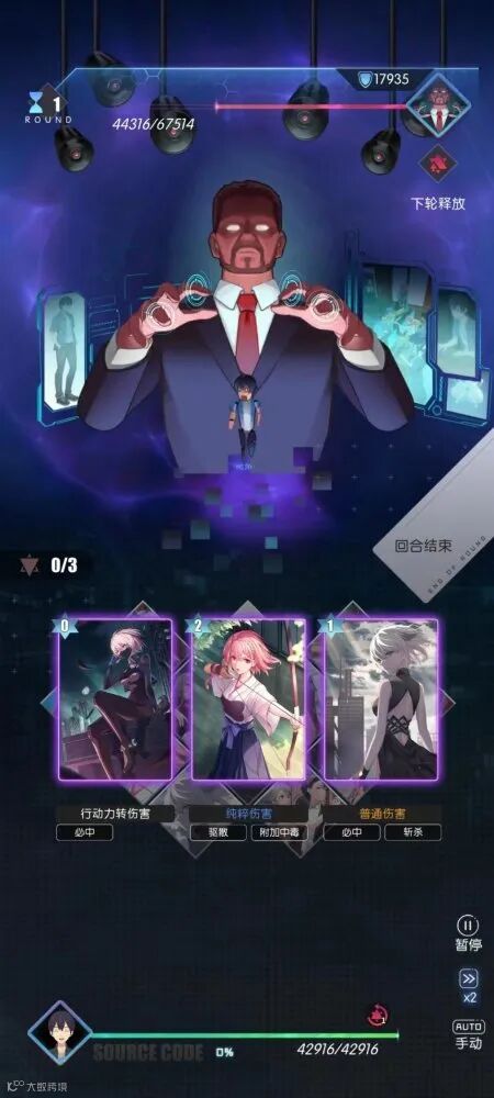战斗中系统每回合会随机从12张卡中选择3张卡,并赋予玩家3点费用,玩家要做的就是根据卡牌的费用来选择手牌释放,次回合就会另外选择3张卡,直至12张卡都被抽过一次后才会重置。虽然战斗系统简单,但是随机性太强,假如boss在第一回合上了个buff,你12张卡中有3张净化,都不一定能在前三个回合中抽到。并且主线的战斗力跨度极大,只能依靠运气好,把己方的buff上满,才能在相差1w战力的对局中取胜,用神经刀形容再合适不过了。