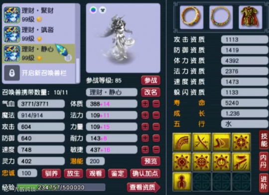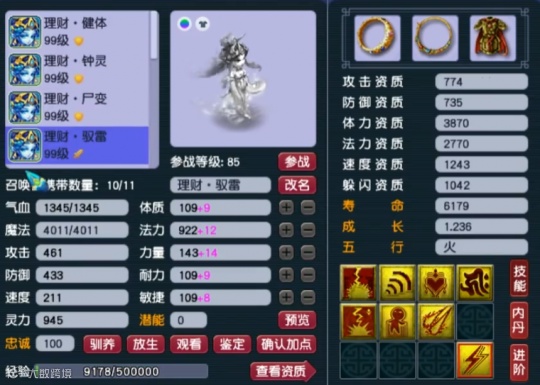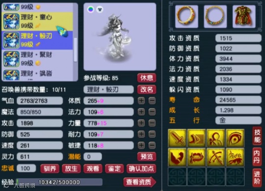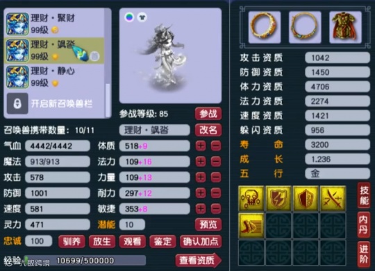 第九只召唤兽为8技能净台卡速,属于防催眠、抗性足的PK宠。