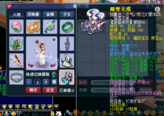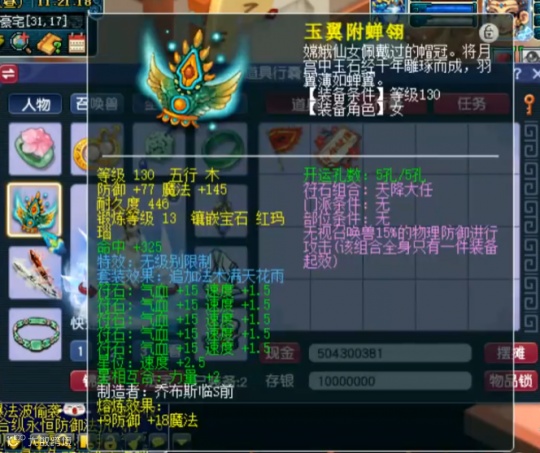 虽然这位玩家的装备算不上顶尖,但其配置的非常科学。比如,发钗和武器均为物理系提升伤害的重要手段,所以带无级别满天是没什么问题的。至于腰带、鞋子、项链、衣服,则采用了特技、愤怒、简易模式,性价比极高。
