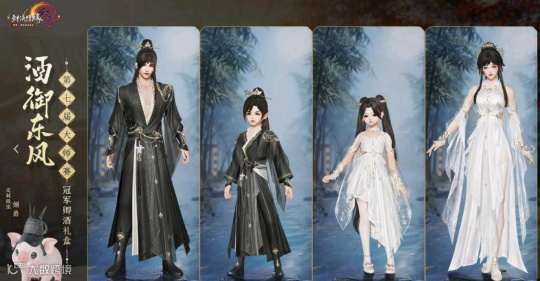 卿酒俱乐部在上次获得大师赛冠军后,也就诞生了这款外观。成女束起的长发显得优雅而又干练,雪白的长裙点缀着金色的装饰和战队队标,既不那么单调,又增添了几分尊贵。而成男则是以黑金为主题,同样是雍容华贵的路线。