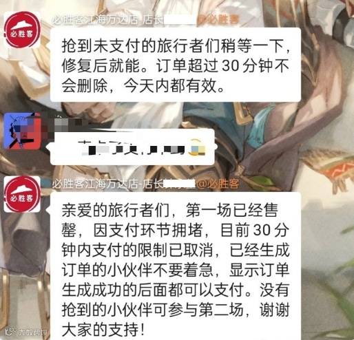 期间,必胜客各个门店的店长已经在尽力解释了。可处于超负荷运转状态下的服务器,还是不堪重负,处于停摆状态中。超话的网友比较激动,调侃道:“送钱都不收。”也是为了平复大家的心情,必胜客随即更改了原先的支付规则,只要生成订单的用户后续就可以完成支付。