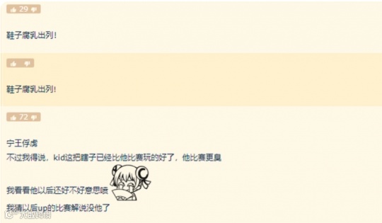 事后,一堆水友也是嘲讽到:“鞋子腐乳出列!”,“我得说,kid这把瞎子已经比他比赛玩的好了,他比赛更臭”,“不知道KID他以后还好不好意思喷,我清以后up的比赛解说没他了”……
