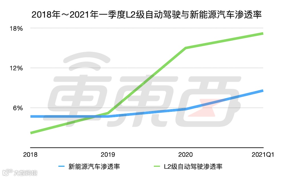 ▲2018年~2021年一季度L2级自动驾驶与新能源汽车渗透率比较