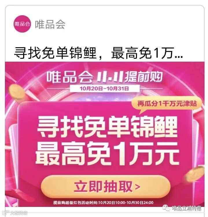 唯品会双十一活动火爆开启,最高免1万元(11月3日)——可微信收藏,每天抽三次!