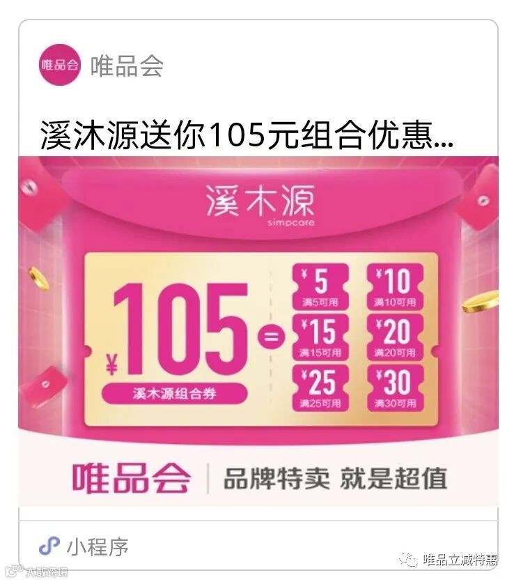 溪木源送你105元组合优惠券。1张满30减