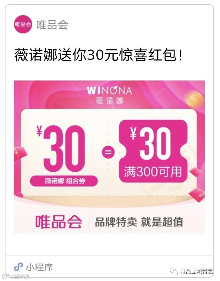 薇诺娜送你满300减30优惠券(8月28日)——券被领完,可联系后台
