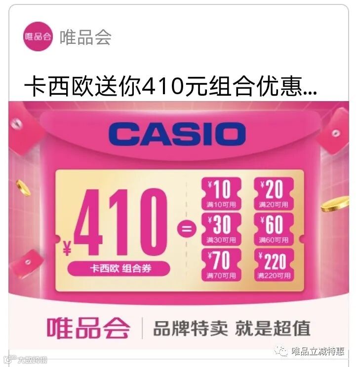 CASIO卡西欧410元组合优惠券。1张满220减220、1张满70减70、、1张满60减60、1张满30减30、1张满20减20、1张满10减10。领取后,3天有效。