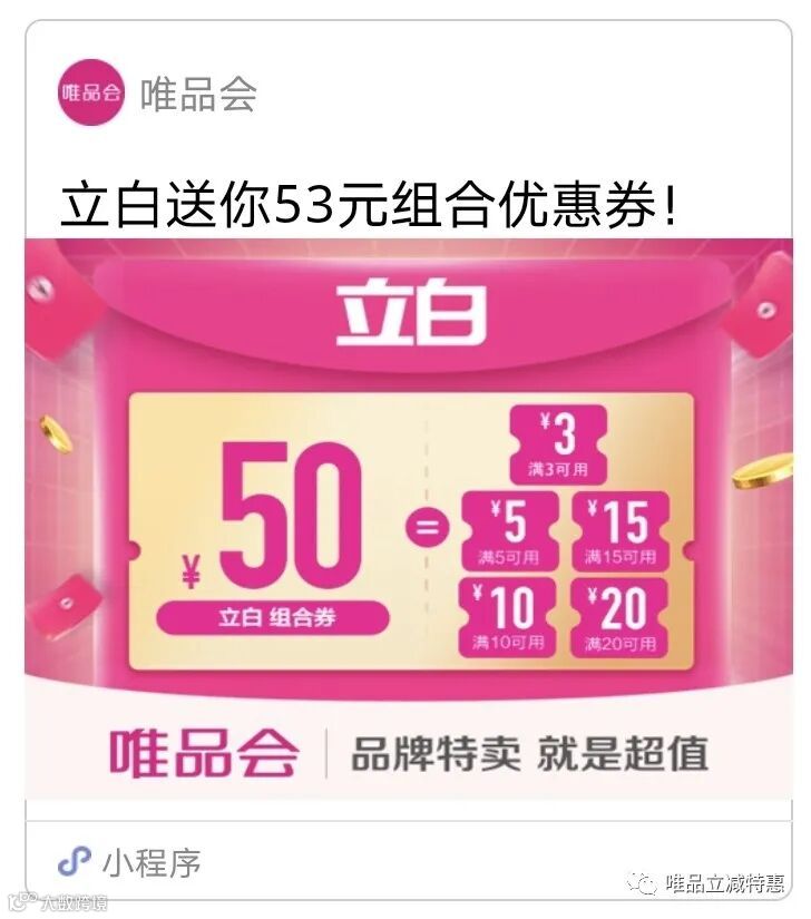 立白送你53元组合优惠券。1张满20减20、
