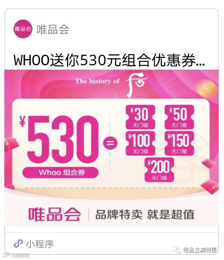 WHOO后送你530元组合优惠券。一张满200减200、一张满150