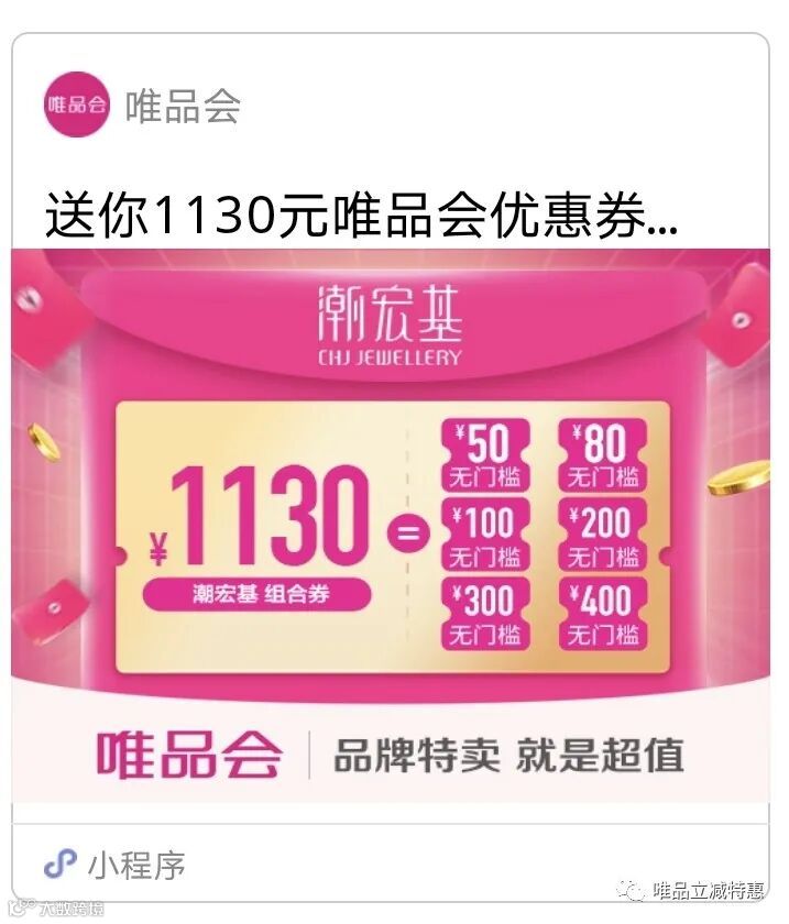 潮宏基送你1130元组合优惠券。一张满400减400、一张满300减300、一张满200减200、一张满100减100、一张满80减80、一张满50减50。领取后,3天有效。