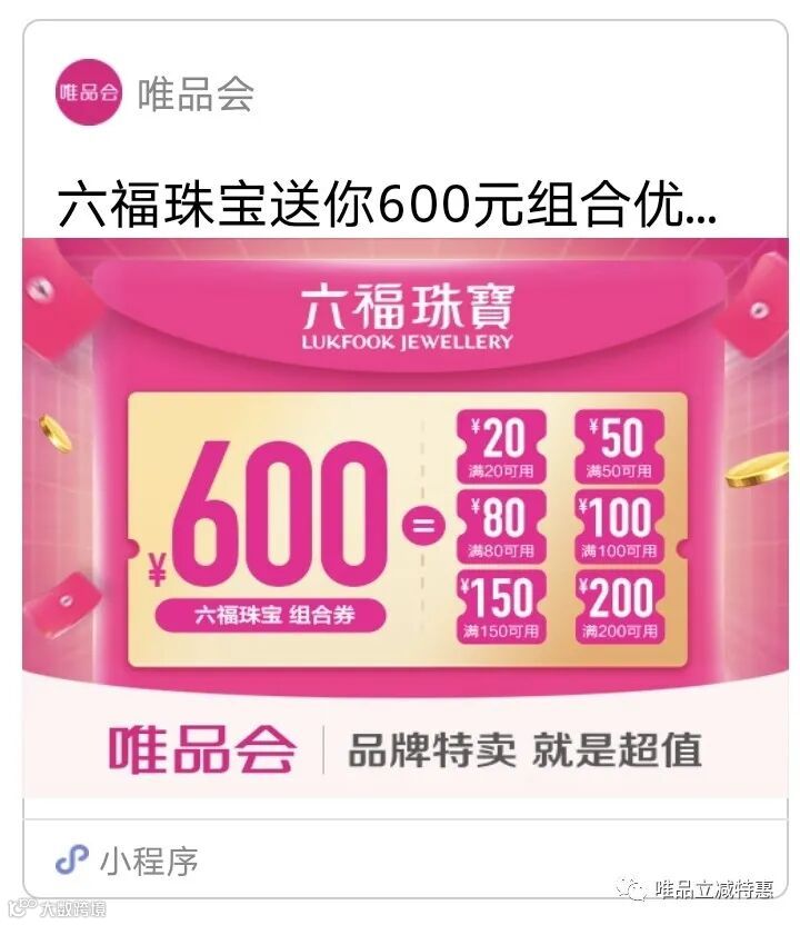 六福珠宝送你600元组合优惠券。一张满200减200、一张满150减150、一张满100减100、一张满80减80、一张满50减50、一张满20减20。领取后,3天有效。