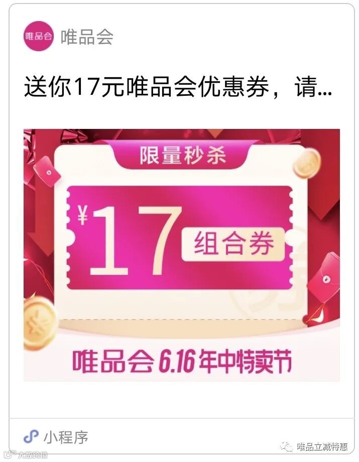唯品会满17-17组合优惠券(6月19日)——券被领完,可联系后台
