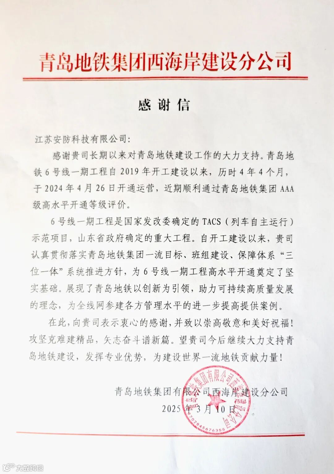 近日,江苏安防科技有限公司收到来自青岛地铁集团西海岸建设分公司的表扬信,信中对江苏安防在参建青岛地铁6号线一期工程——智慧运行智能安防、智慧安检系统集成项目中所展现的技术实力、执行能力和社会责任感表示了感谢。