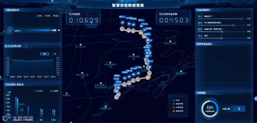 本项目的智慧安检系统也是由江苏安防自主研发且在青岛地铁首次应用。在扒山站集中判图中心,智慧安检系统通过智能分析及多种数据来源支撑,实现对全线安检的集中判图,优化安检资源配置,优化安检人员需求,通过客流量大小实时调整安检人员安排,优化安检模式。依托边缘AI智能识别,辅助判图员进行现场判图,实现平稳过渡,保证安检工作正常有序进行。
