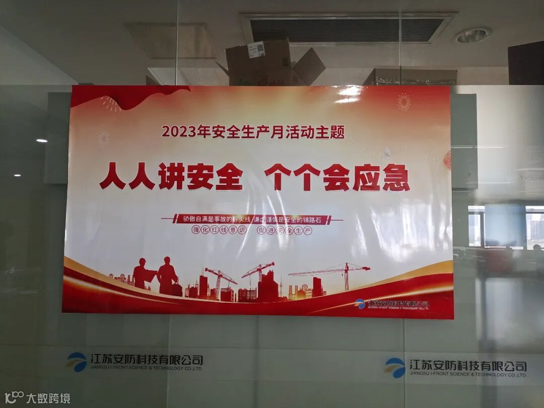 三是文化宣导融入公司。为提升职工安全意识,江苏安防在办公楼一楼大厅、办公楼入口等醒目位置,张贴或悬挂安全标语、挂图等,广泛深入开展安全宣传,进步强化职工安全“红线”意识和“底线”思维,在全公司营造了浓厚的安全生产工作氛围。