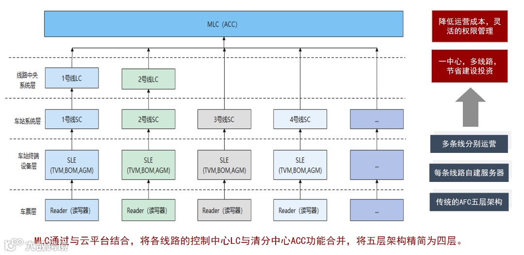 由同一运营主体运营的多条线路共用的线路中心,是多条线路AFC系统的核心部分。MLC将各线路的控制中心LC与清分中心ACC功能合并,将五层架构精简为四层,MLC既能连接既有LC,也具备直接连接SC的能力,这样后续建设可直接节省LC的建设成本,也减轻运维压力。MLC中心有生产系统、运维中心系统、票务中心系统、接入测试系统等系统。