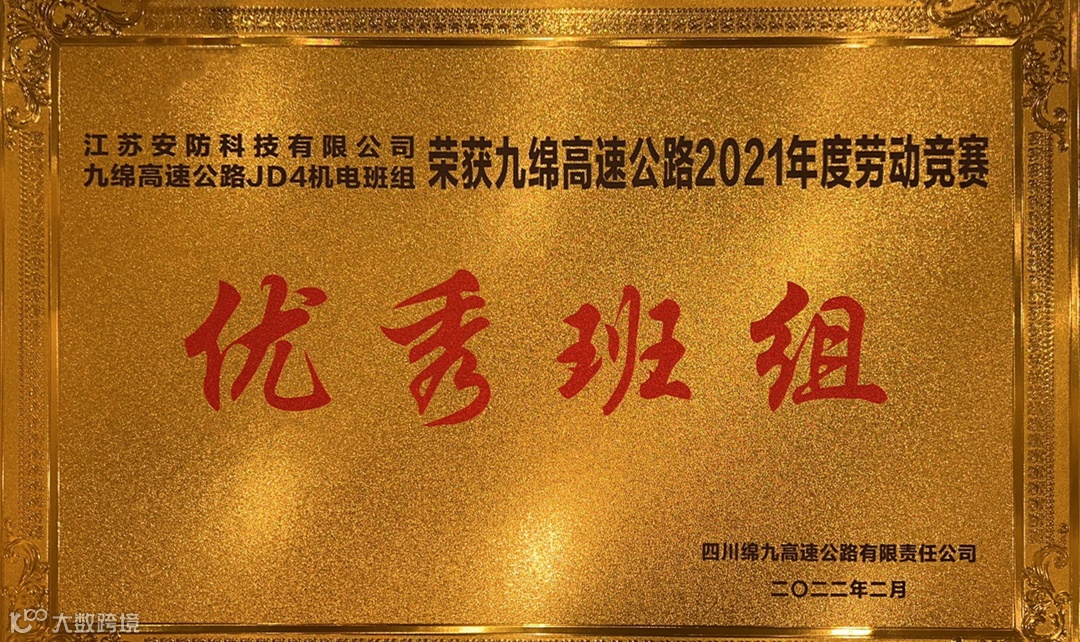 自2021年9月28日起,业主单位四川绵九高速公路有限责任公司召开了九绵高速劳动竞赛活动,与各项目班组签订责任书、责任状。在江苏安防科技有限公司九绵高速公路JD4标段全体成员的不懈努力下,出色的完成了业主方的任务要求,得到业主的高度肯定,获得“优秀班组”荣誉称号。
