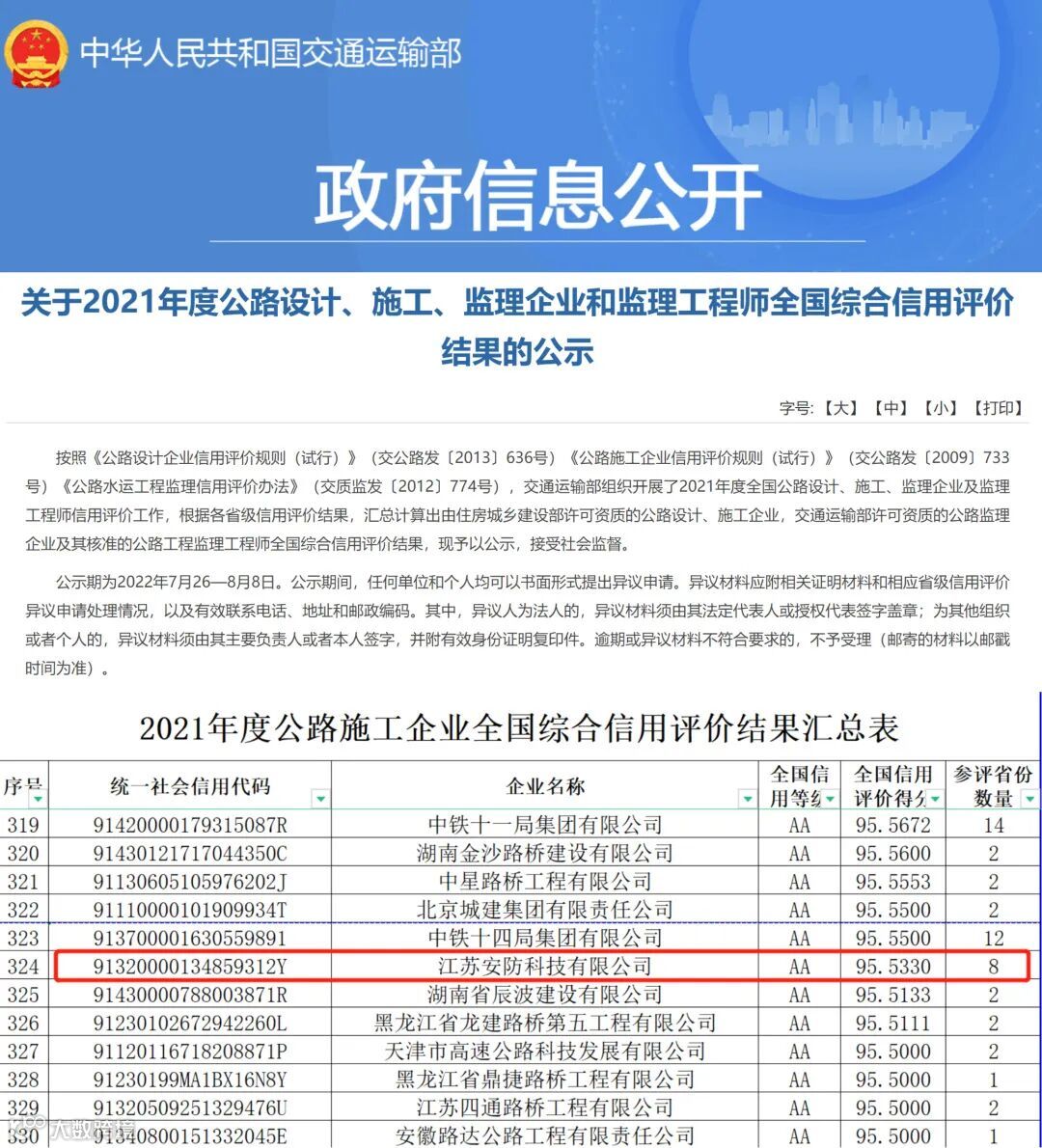 日前,交通运输部发布《关于2021年度公路设计、施工、监理企业和监理工程师全国综合信用评价结果的公示》,江苏安防科技有限公司荣获AA等级信用评价,反映出江苏安防在生产、经营管理上取得的卓越成绩。