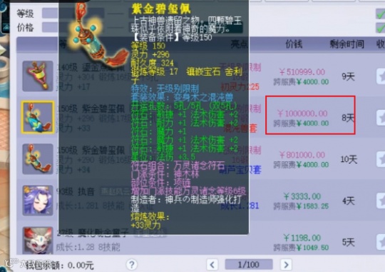 不过,等老王点开藏宝阁之后就不淡定了。目前藏宝阁上初灵227的无级别项链,能卖到100个W。而玩家的那条231灵项链在属性上更胜一筹,多出了4点灵气,所以它的身价达到了7位数水平。
