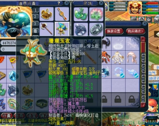 衣服部分是100级初防193,力魔双加42点的任务铠甲,镶嵌8级舍利子,平时拿来刷任务没什么毛病。