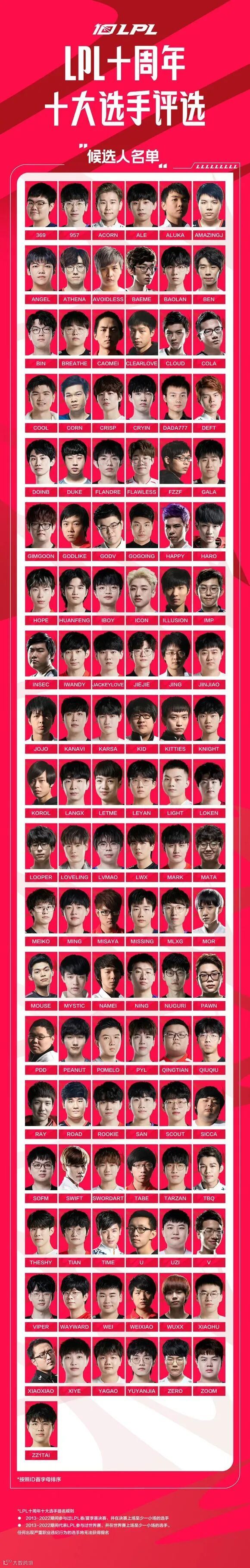 从“远古时期”至今,LPL电竞赛场上曾涌现过数百名选手。官方近期就拟定了一份候选名单,要从他们中选出LPL十大选手。这份候选人名单很长,入选条件却只要满足两点:S3——S12赛季打过赛区决赛,以及S3——S12赛季打过世界赛并拿下过至少一个小胜场。