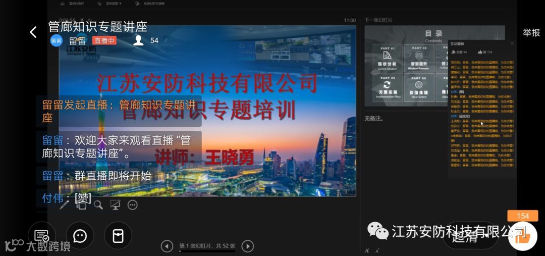 随着江苏安防综合管廊项目承接能力的日渐增强,对管廊团队的实施技术水平要求也随之提升。为此公司特于2019年8月30日开展针对智慧管廊知识讲座,由公司资深的安防工程师王晓勇授课。他曾担任过多个管廊项目的设计、实施及管理工作,具有深厚的管廊系统知识及丰富的实施经验。