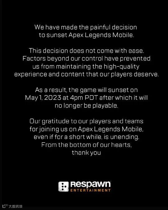 EA在此次发布的停服公告中,提及了游戏关服原因:“《APEX英雄》手游的游戏体验,在后续的更新中无法继续保证如最开始那般的质量。目前所呈现出来的游戏内容,达不到重生工作室的标准。”