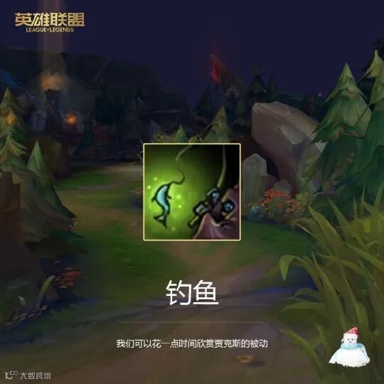 新版的贾克斯在河道站立不动时,会开启钓鱼模式。之后每隔10秒钟,就会得到一个被动层数(一条鱼),奖励为1金币。而当玩家使用“宗师级钓鱼训练师”这个皮肤时,被动层数会直接来到99层。