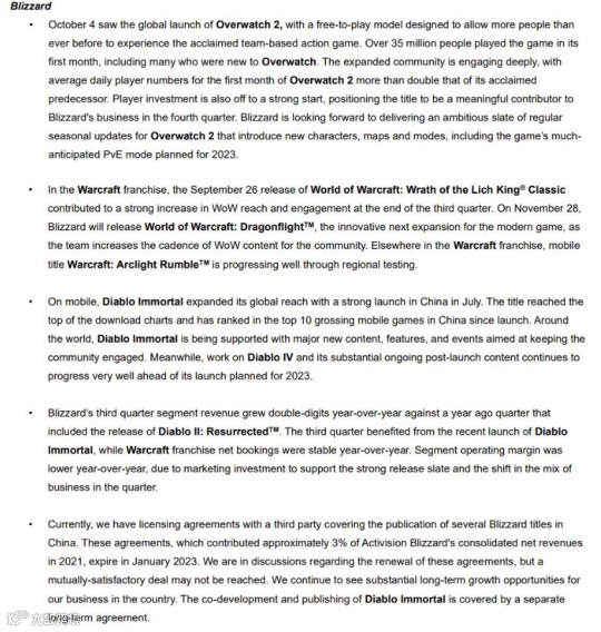 不过动视暴雪在这次的报告中,特别提到了与中国厂商签订的多款暴雪游戏合作协议将到期。原文指出:“目前,我们与第三方签订了许可协议,内容涵盖在中国大陆发布多款暴雪游戏。这些协议约占动视暴雪2021年合并净收入的3%,并将于2023年1月到期。我们正在讨论续签这些协议,但可能无法达成双方都满意的交易。”