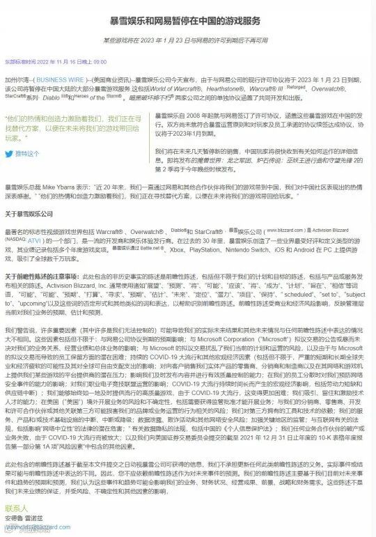 而时隔多日,暴雪娱乐公司在今日正式确定了这件事的真实性。并在公告中指出:将于2023年1月23日,暂停在中国的大多数暴雪游戏服务。