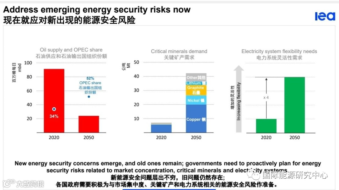 一方面,能源转型需要大量的关键矿物,预计到2050年需求将增加6倍,无疑将引发新的能源安全关切,且极有可能推高转型成本;另一方面,随着以化石燃料为主要动力的常规灵活性电源减少,加之新能源电力系统的智能化、数字化水平快速提升,如到2050年,电力系统灵活性需求将比2020年增加3倍,无疑将为未来能源系统带来新的安全风险。此外,未来如何确保以可承受的价格,安全稳定供应能源和能源相关关键商品,这一命题的重要性也将愈发凸显。