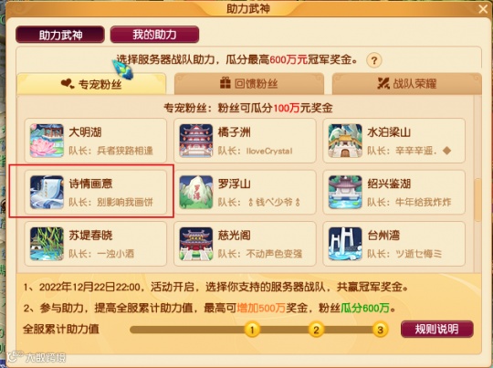 今年的武神坛明星赛和往年不同,服战队自己可以选择奖金分成模式。其中“专宠”模式能够让广大粉丝获得最大利益,最低瓜分100W,最高可瓜分600W。虽然选择“专宠”模式的服战队比较多,但是大部分都是二流战队,真正排的上榜的就只有猴哥的诗情画意和2008。