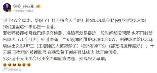 由于英雄联盟的数据是定期删除的,所以最近几个月没有开脚本的邪剑仙,躲过了这一劫。加上态度够好,所以官方愿意给她机会。