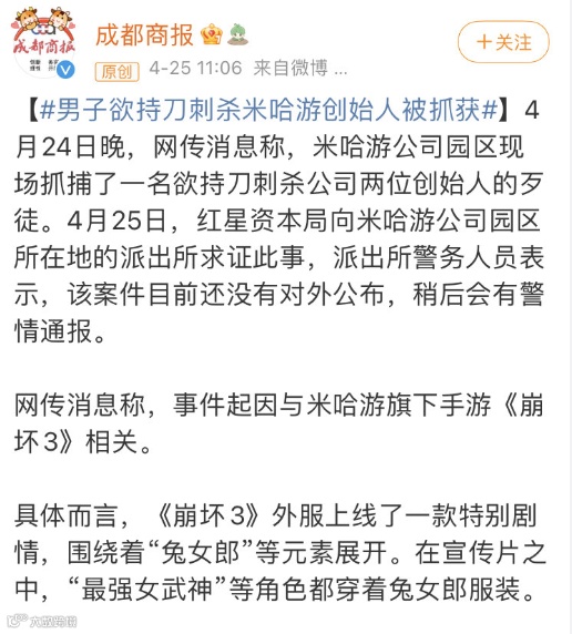 玩家找到游戏公司员工正面对线,这种情况过去也曾发生过。又因为玩家往往是带着怨气来的,所以场面往往不好控制。去年在米哈游公司园区,便有一名玩家因为持刀进场想要Gank公司的两位创始人遭到了逮捕。