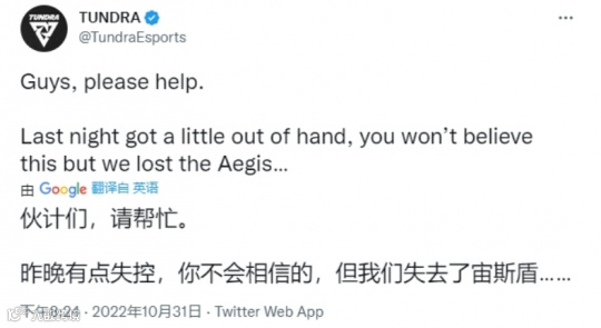 根据目前Tundra官推来看,由于在夺冠之夜过于兴奋与激动,他们居然弄丢了不朽盾,搞得整个战队都懵了。为澄清这不是开玩笑,Tundra还连续发了多条推特,表明如此离谱的事情确实就发生在了自己战队头上。