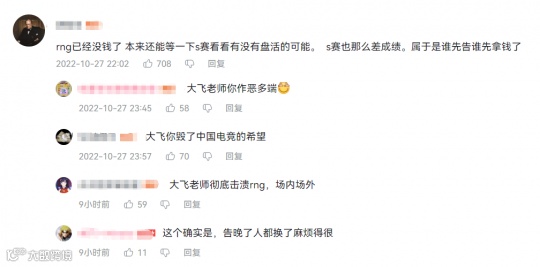 对此,网友也十分理解:“RNG已经没钱了 本来还能等一下S赛看看有没有盘活的可能, S赛也那么差成绩。属于是谁先告谁先拿钱了”,“大飞你毁了中国电竞的希望”,“xlb没打出来 能给你pdd钱啊,你还起诉,小心我法务部让你倒给钱”,“只能说RNG的法务部打出身价了”……
