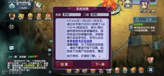 近日,一位玩家收到了系统消息,系统提示他在某个时刻,通过给予的方式获得了1007797761两梦幻币,其中1两为其他玩家被骗损失,他也因此喜提苦行。不过,这波操作虽然看似神奇,但终归还是涉及到了线下交易,被抓进苦行也确实无可厚非。