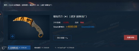 而在IGEX平台上,同样的“锯齿爪刀 虎牙”拍卖价为3598元,Steam参考价则是4690元。