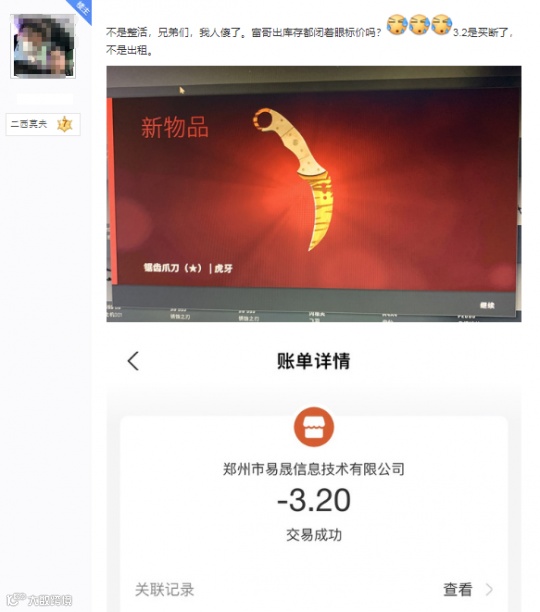 近期就有一位CSGO玩家,在贴吧发帖展示了自己以白菜价入手的“锯齿爪刀 虎牙”,这惹得无数网友投来了羡慕的眼光。要知道,在通常情况下饰品交易能抹个零头就已经算捡漏了,但这位老哥是只剩零头了!仅花了3.2元,他就拍下了这个饰品。