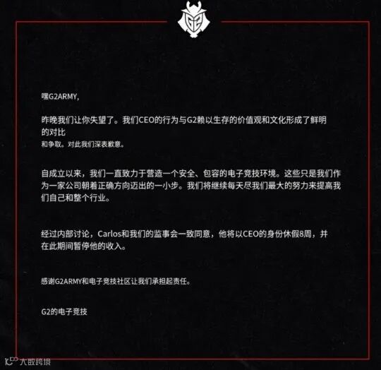 G2不久后就发布了官方公告,向广大玩家和粉丝致以了歉意。对于Carlos本人的处罚则是:强制休假8个周并停发期间的工资。