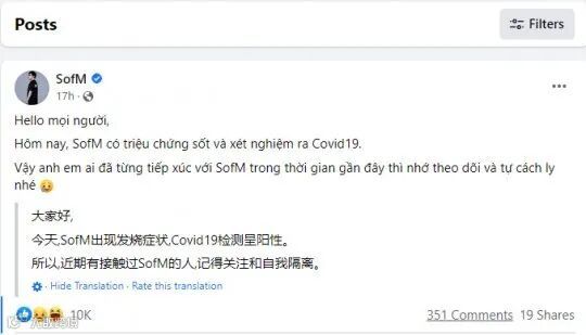 只是相较于国内,越南的疫情形势显然要更加严峻一些。昨日,Sofm在脸书上更新了动态,称自己出现了发烧症状,Covid19检测呈阳性。