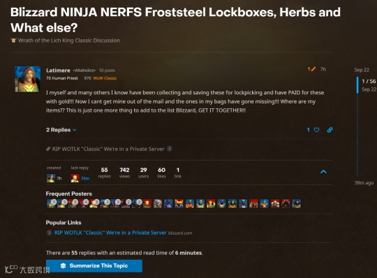 而就在工作室不断炒这些材料价格的时候,却有玩家发现自己囤积到背包内的“偷跑”道具与交易这些道具赚得的金币全都不翼而飞了?!对此,游戏内GM人员给出的解释,则是暴雪上线了一个热修补丁,删除了这些异常出现的物品,来维护WLK怀旧服的稳定运营。