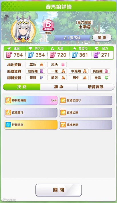 智力:影响技能触发几率,降低类似“暴冲”“出门慢”这类负面事件的发生几率,在比赛中会选择较好的路径去跑。