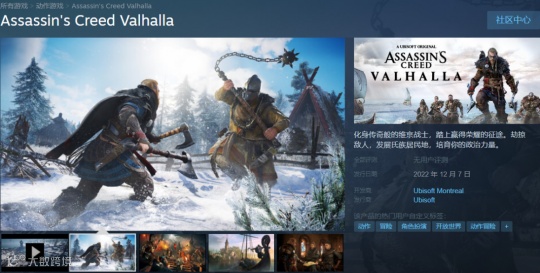 不过在秋促到来之前,Steam平台却意外出现了一款发布于两年前的作品的身影。根据商店页面信息显示,《刺客信条:英灵殿》将于2022年12月7日登陆Steam。而这也是继2019年之后,首款加入Steam的育碧游戏。