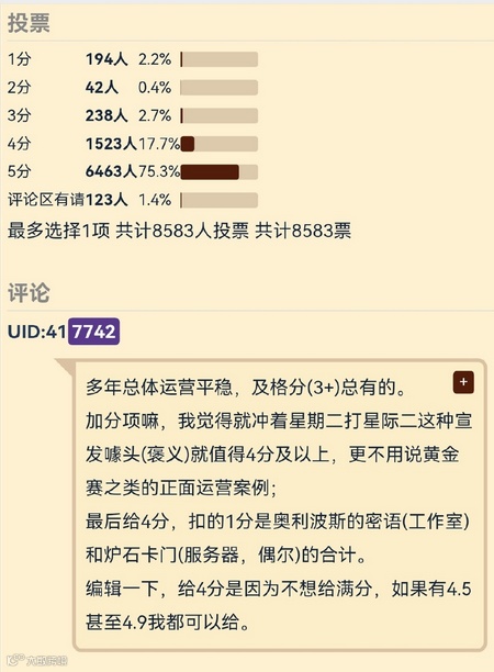 总计8583人投票,九成以上的网友愿意给网易打出4-5分的评价。这在向来纷乱的NGA论坛投票,已经是相当难得的投票结果了。