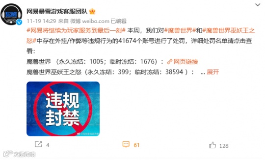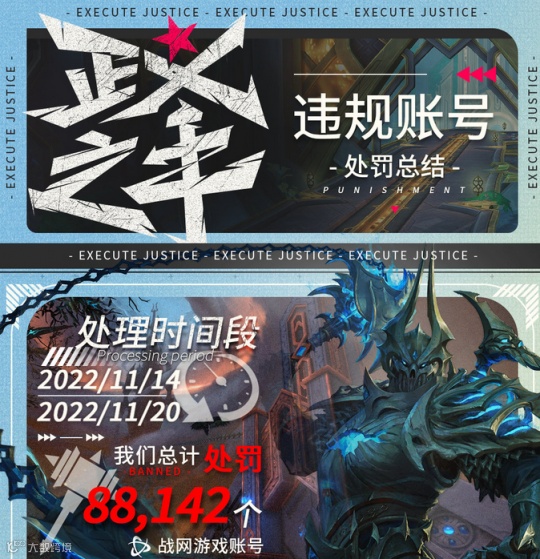 在2022年11月14日至2022年11月20日期间,网易暴雪游戏客服团队共计处罚了88,142个战网游戏账号,其中就包含《魔兽世界》、《守望先锋:归来》、《魔兽世界:怀旧服》、《炉石传说》、《风暴英雄》、《星际争霸》等曾红极一时的游戏作品。