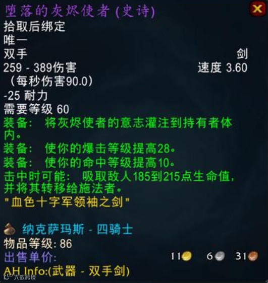 这件装备就是在最近引起各路老板争夺的“绝版武器”堕落的灰烬使者,由于NAXX将会在WLK前夕就飞去诺森德的关系,直接导致这个副本内产出的所有武器与防具都会变成绝版。这就导致了一群有着收藏癖好的老板,开始一掷千金地在游戏内组织起NAXX摸奖团,每周固定招人去跳怪摸奖,看看能不能赶在最后一刻摸到堕落的灰烬使者,体验一把成为血色修道院大佬的感觉。